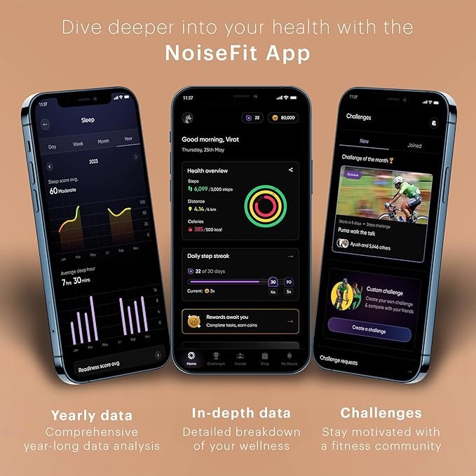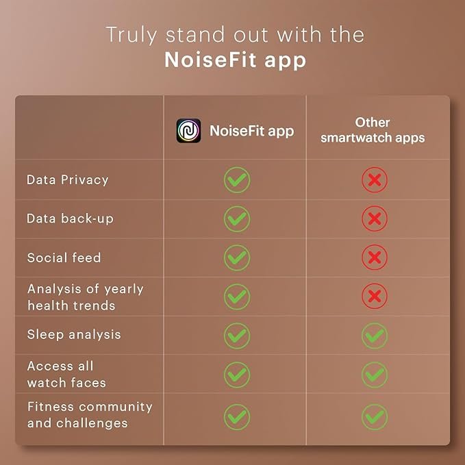 - BT Calling: Stay connected on the go making every call effortlessly convenient.;NoiseFit app: Connect with the NoiseFit app where your health data and privacy are always protected. Unlock your peak potential by participating in challenges, track your progress, and keep pushing your limits with a community of fitness enthusiasts.